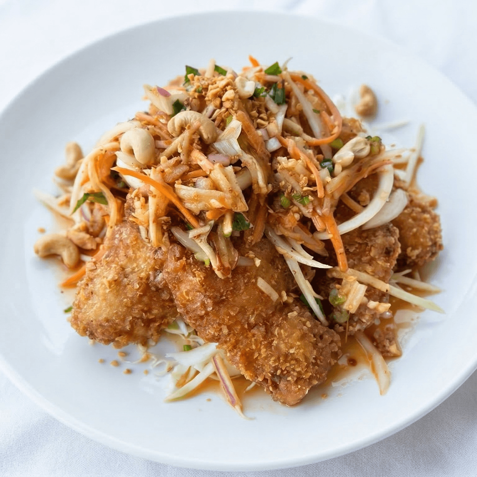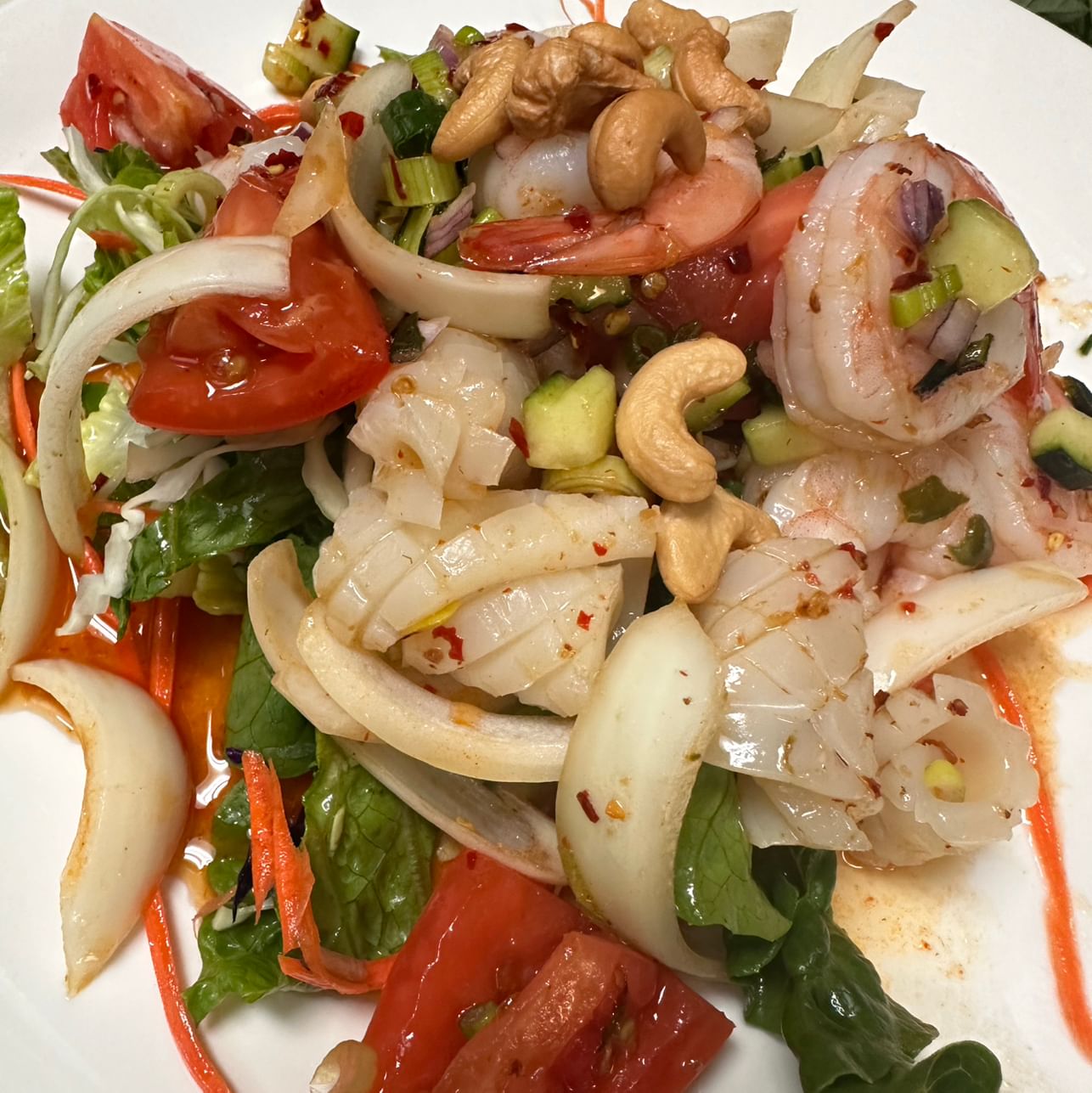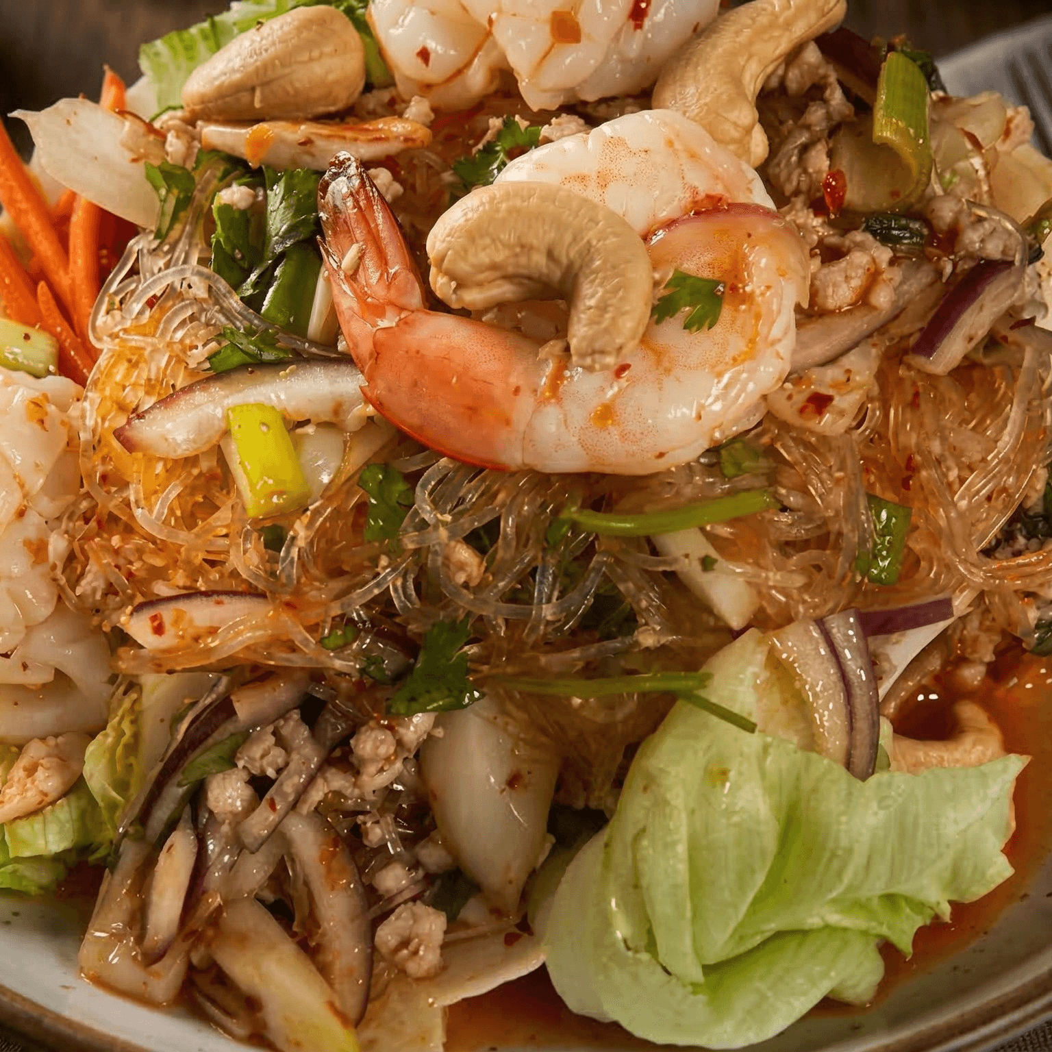 Mild silver noodles, shrimp, calamari, minced chicken, onions, carrots in a lemon dressing topped with cashew nuts
