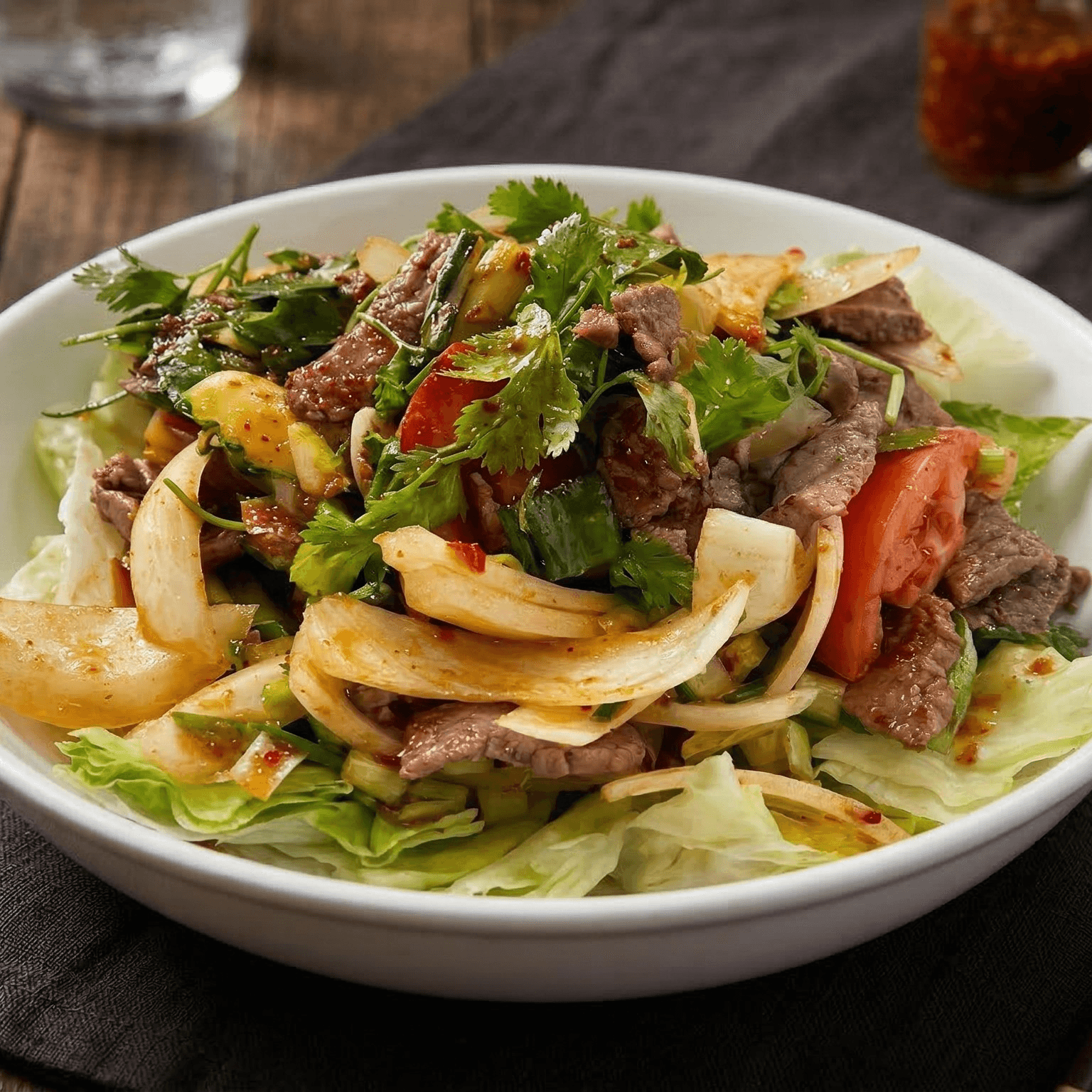 With lemon juice, fish sauce, lettuce, tomatoes, red onions and chili peppers