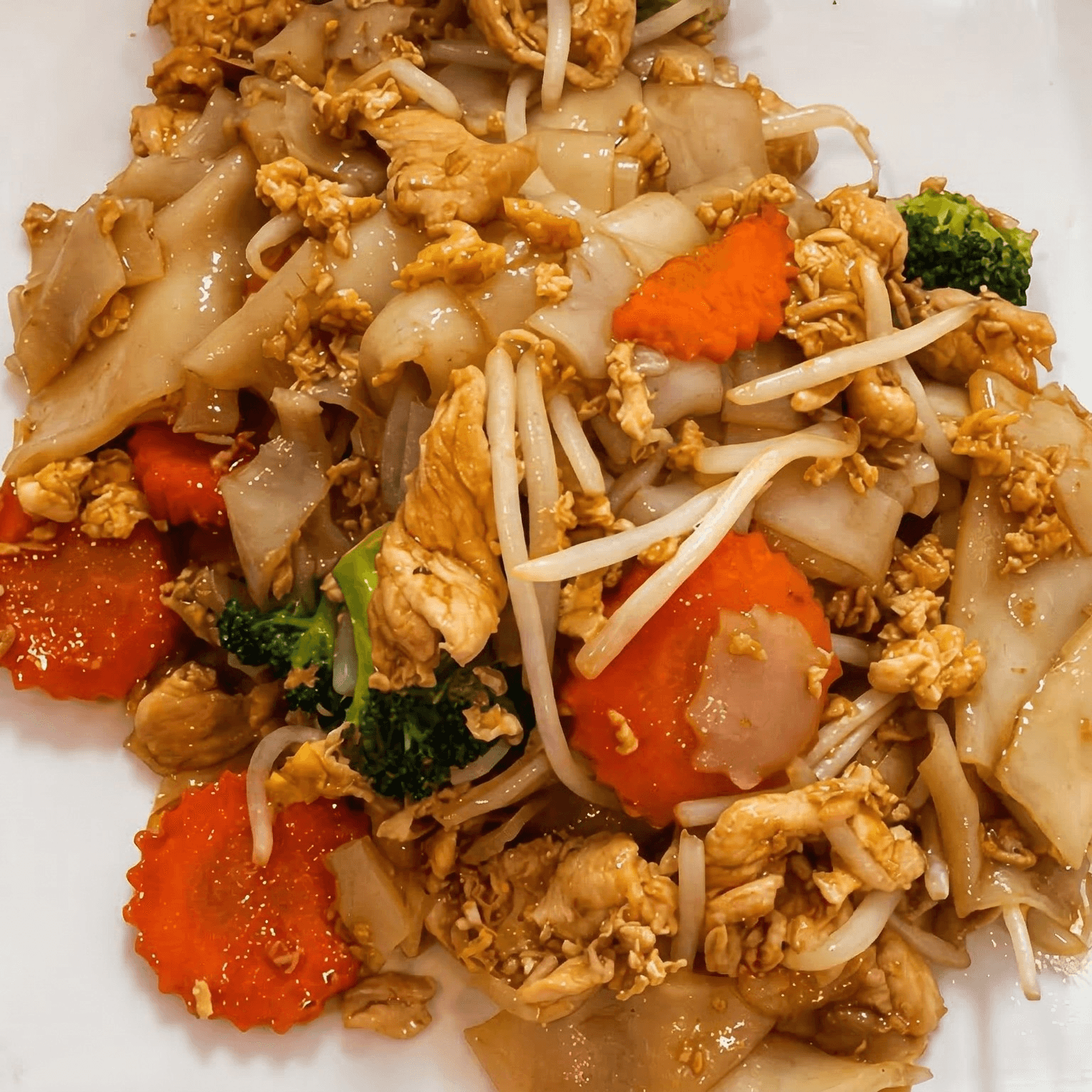 Pan-fried flat rice noodle with broccoli, carrot, bean sprouts and egg
