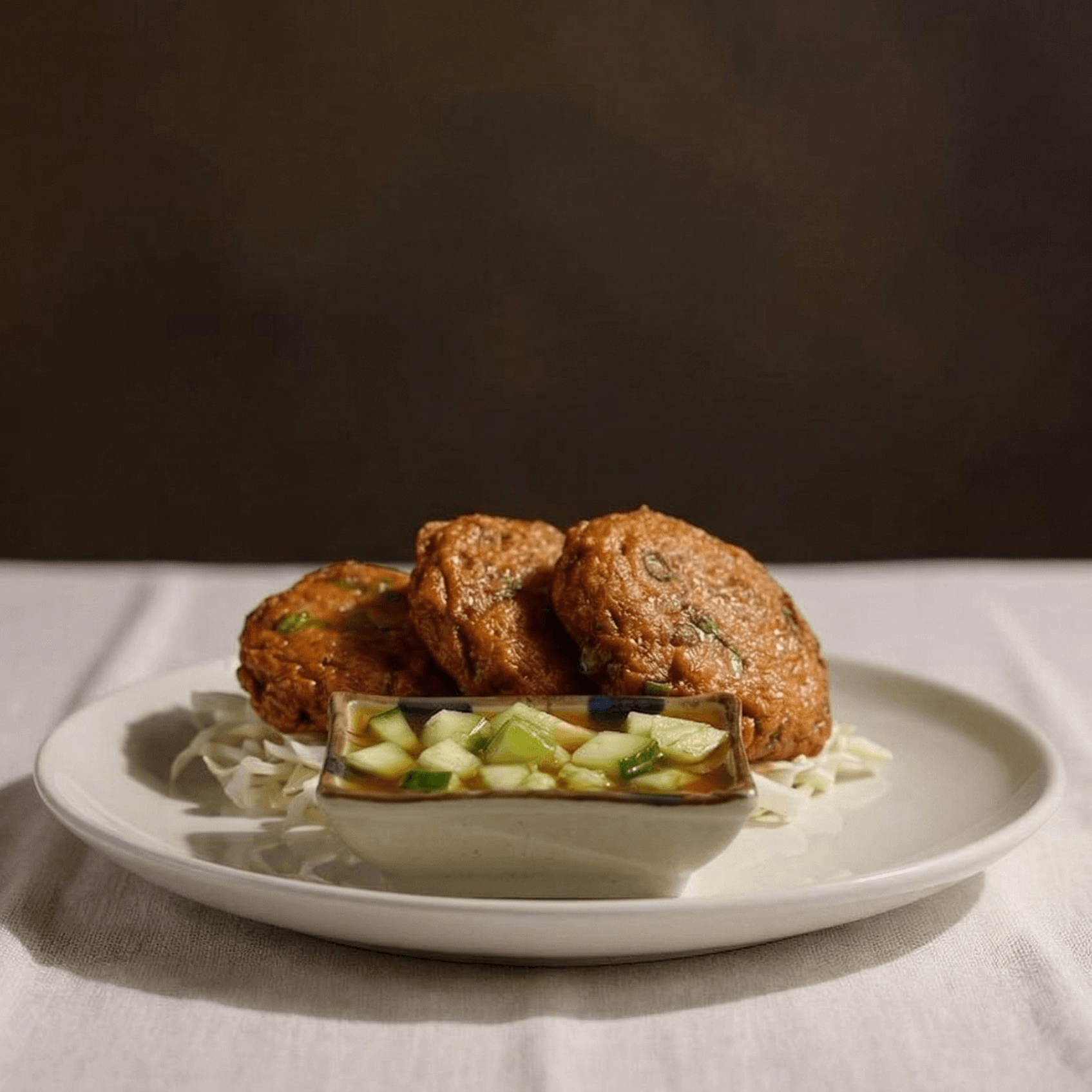 (4). ground white fish, blended with curry pasta, sliced green beans, deep-fried, served with cucumber salad