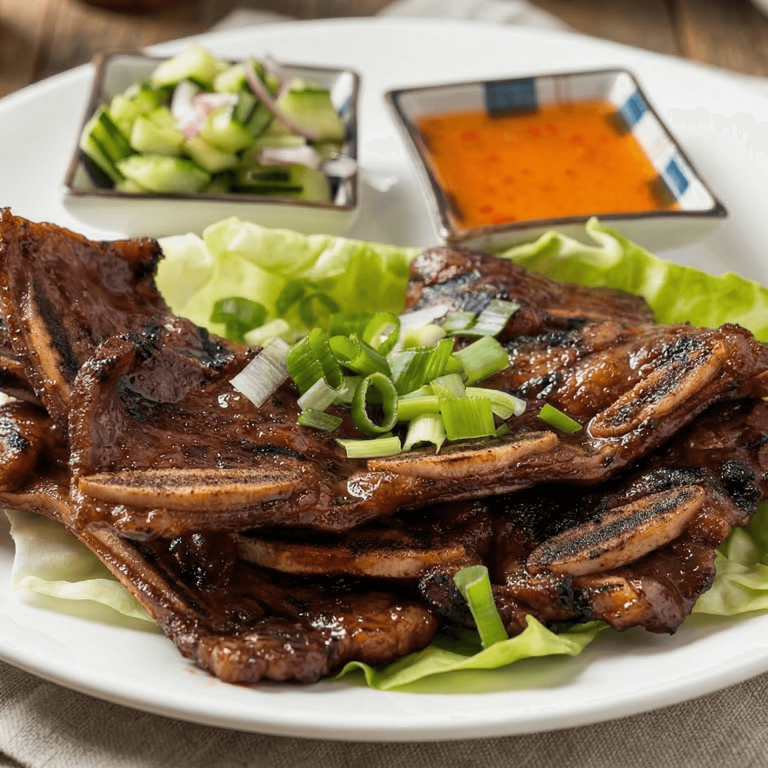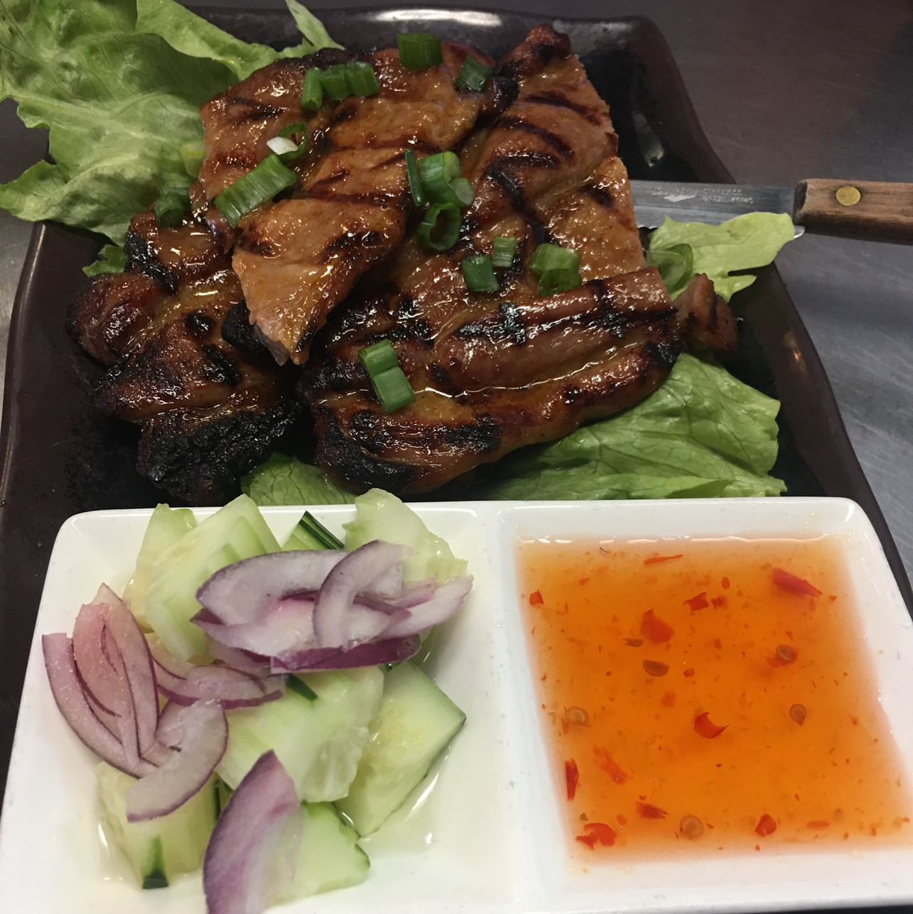 Marinated tender meat with house special sauce, served with cucumber, and sweet and sour sauce on the side