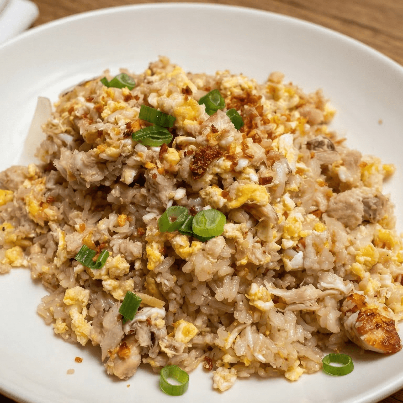 Fried rice with egg, real crab meat, onions, topped with our homemade fried garlic