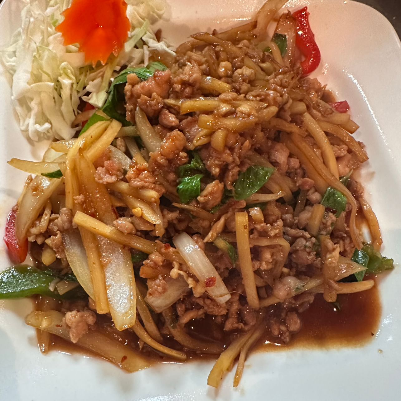 Ground meat with onions, bell peppers, chili sauce, bamboo and basil