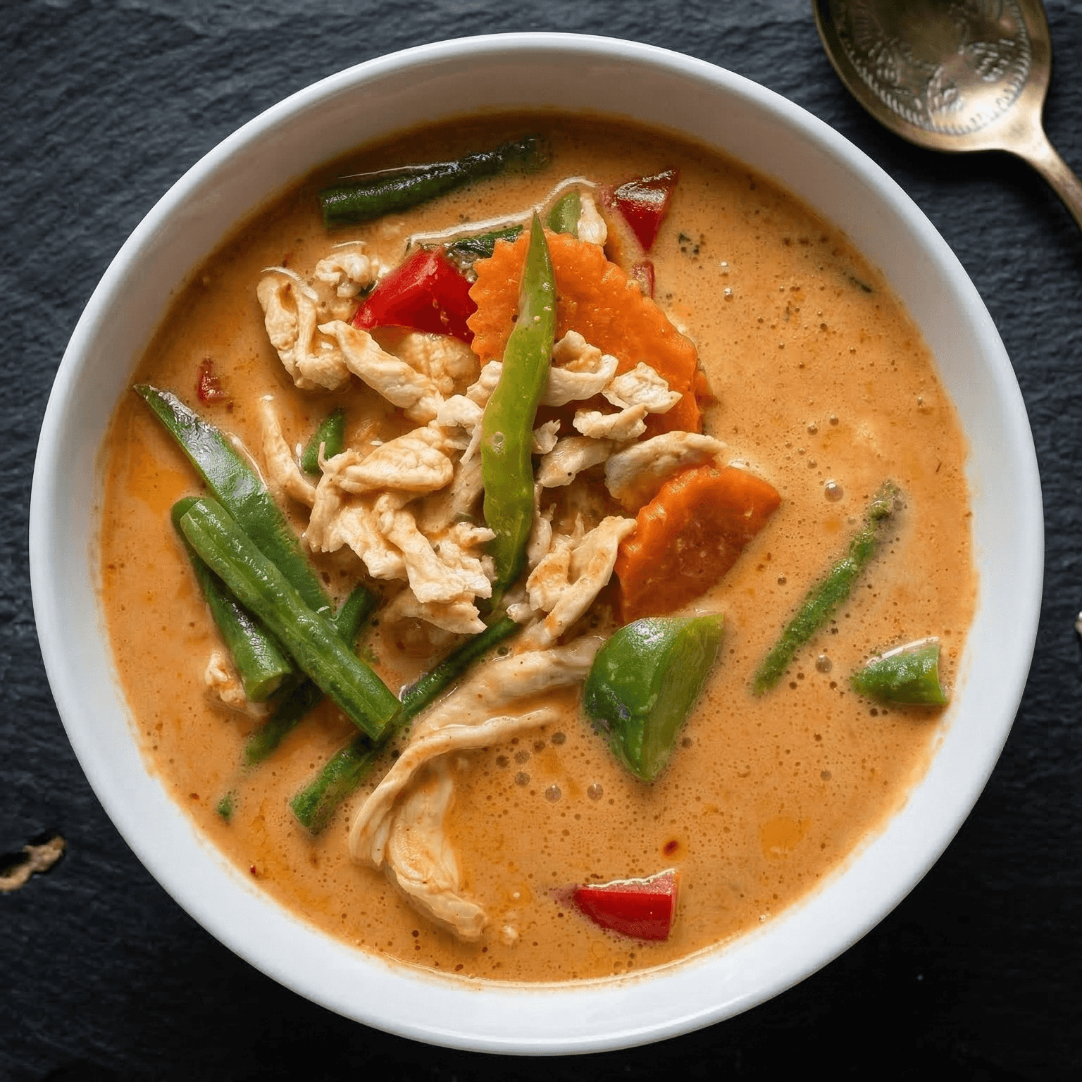 Red curry coconut milk with lime leaves, peanut sauce, bell pepper, carrot, green bean and basil