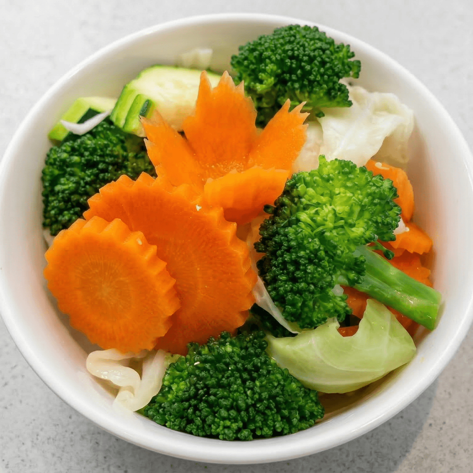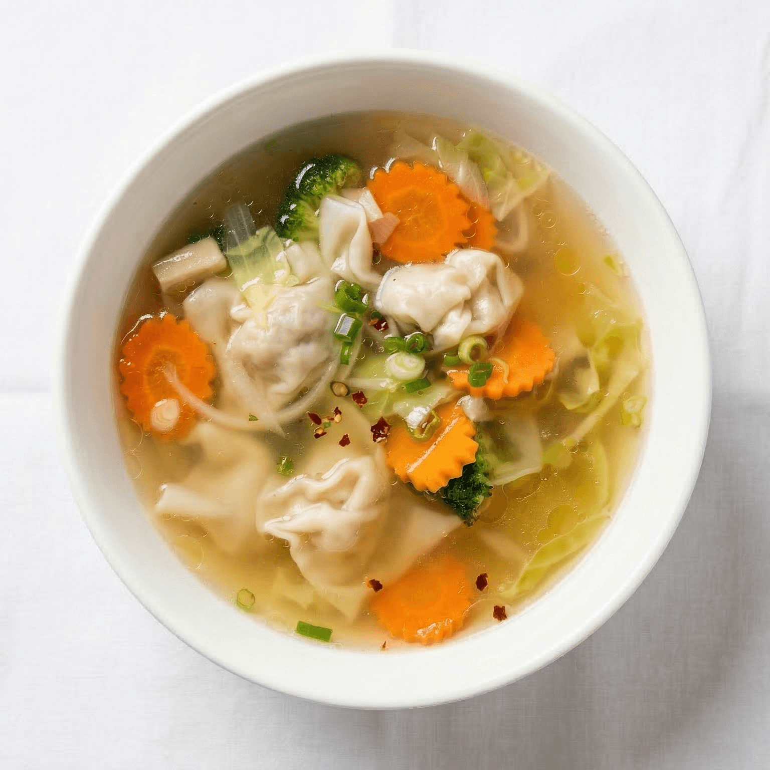 Wonton stuffed with ground chicken in chicken broth, and onion, cabbage, broccoli