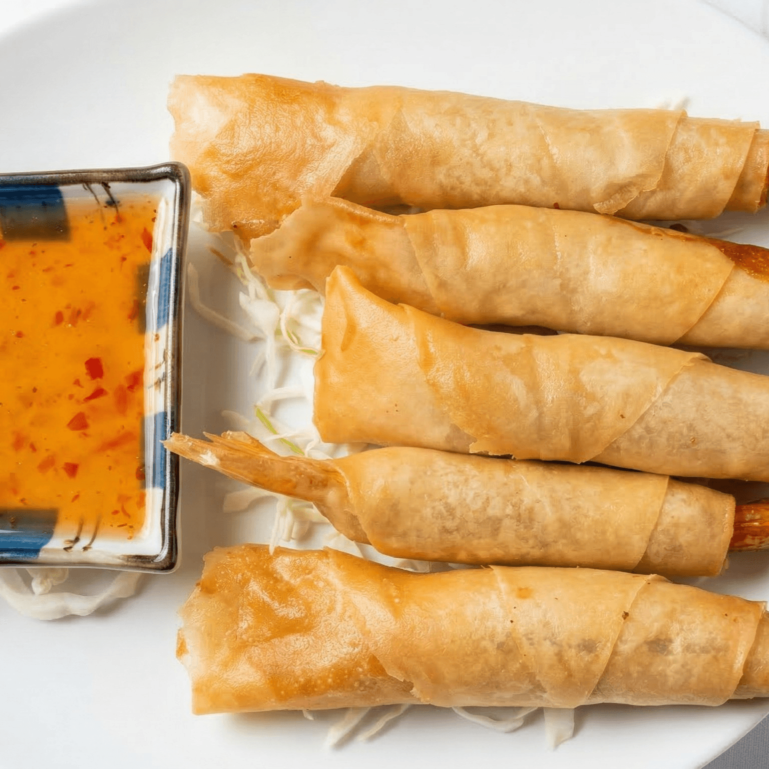 (5), marinated prawns wrapped in egg roll skin, deep-tried and served with sweet and sour sauce