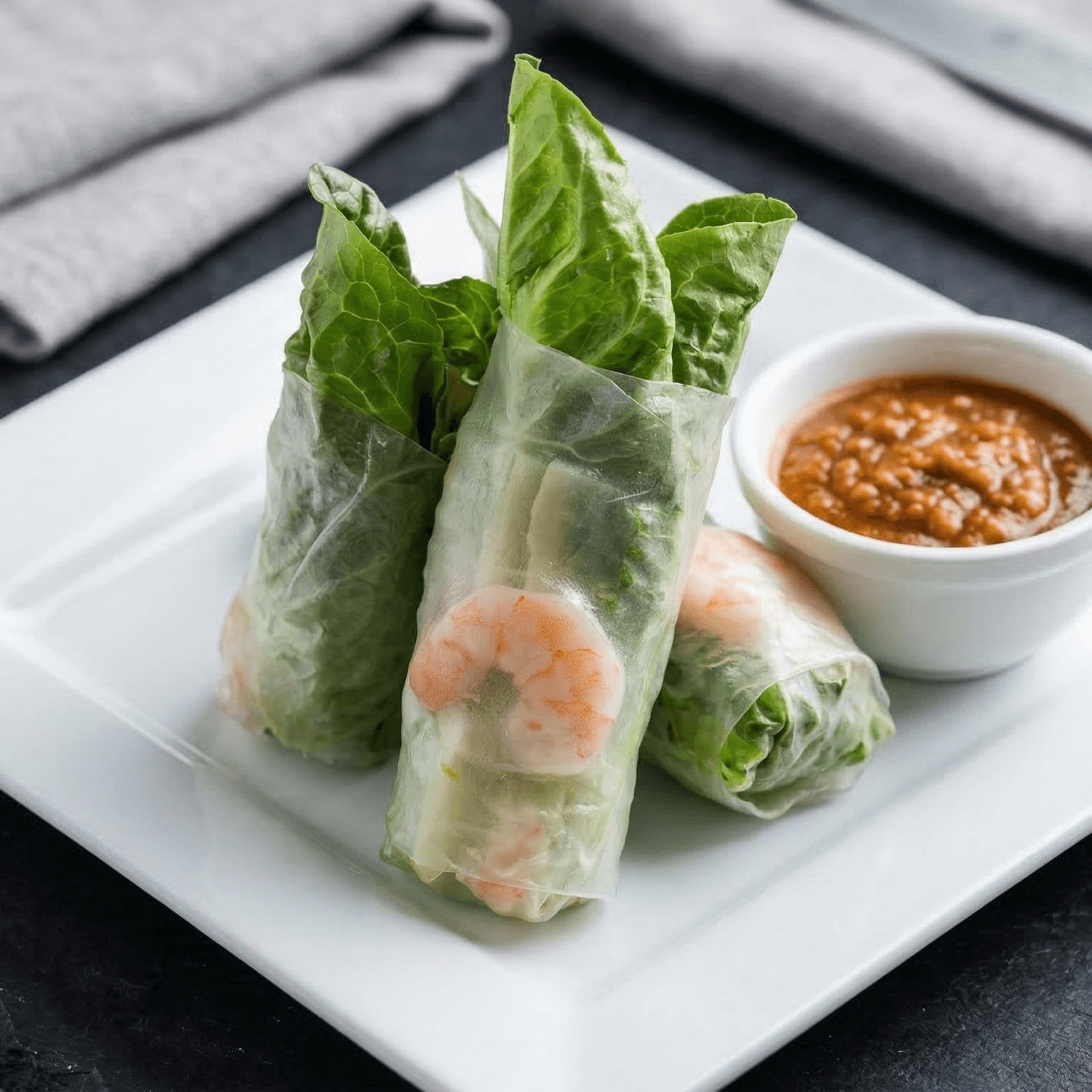 Steamed rice skin filled with rice noodles, mixed vegetables, chicken, shrimp, served with peanut sauce