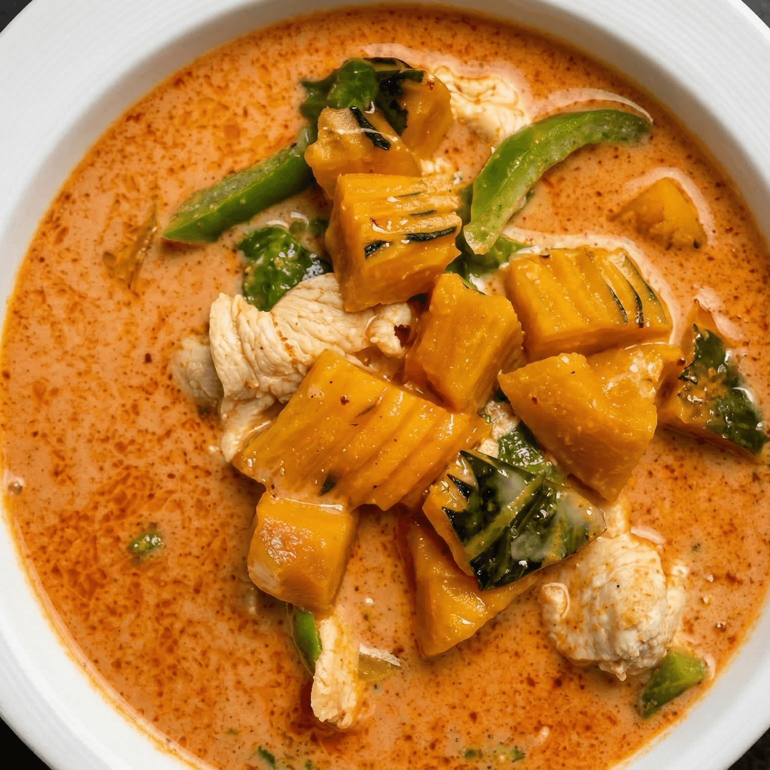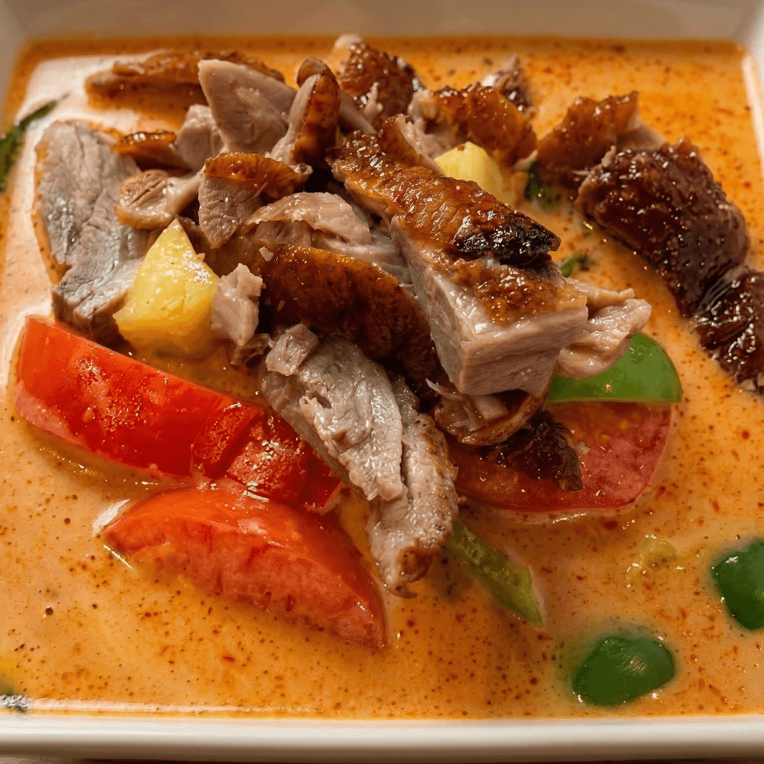 Mild. Roasted duck served in red curry with coconut milk, pineapple tomatoes, bell pepper and sweet basil