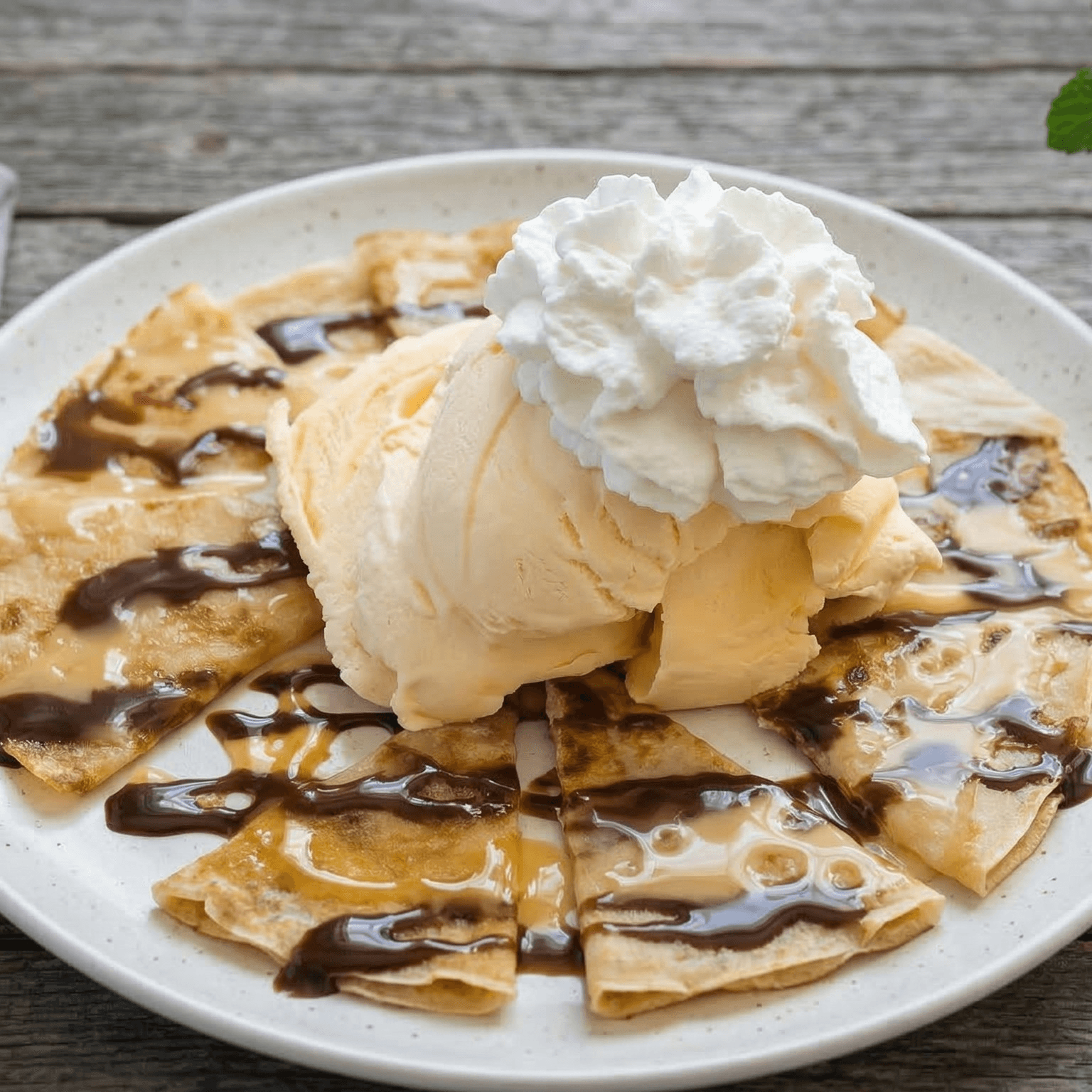 Grilled roti bread serve with condensed milk, chocolate syrup and a scoop of vanilla ice-cream