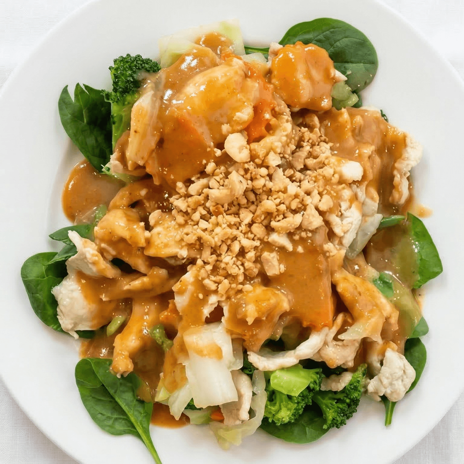 Stir-fried meat with coconut milk, carrot, cabbage, broccoli topped over spinach, and peanut sauce