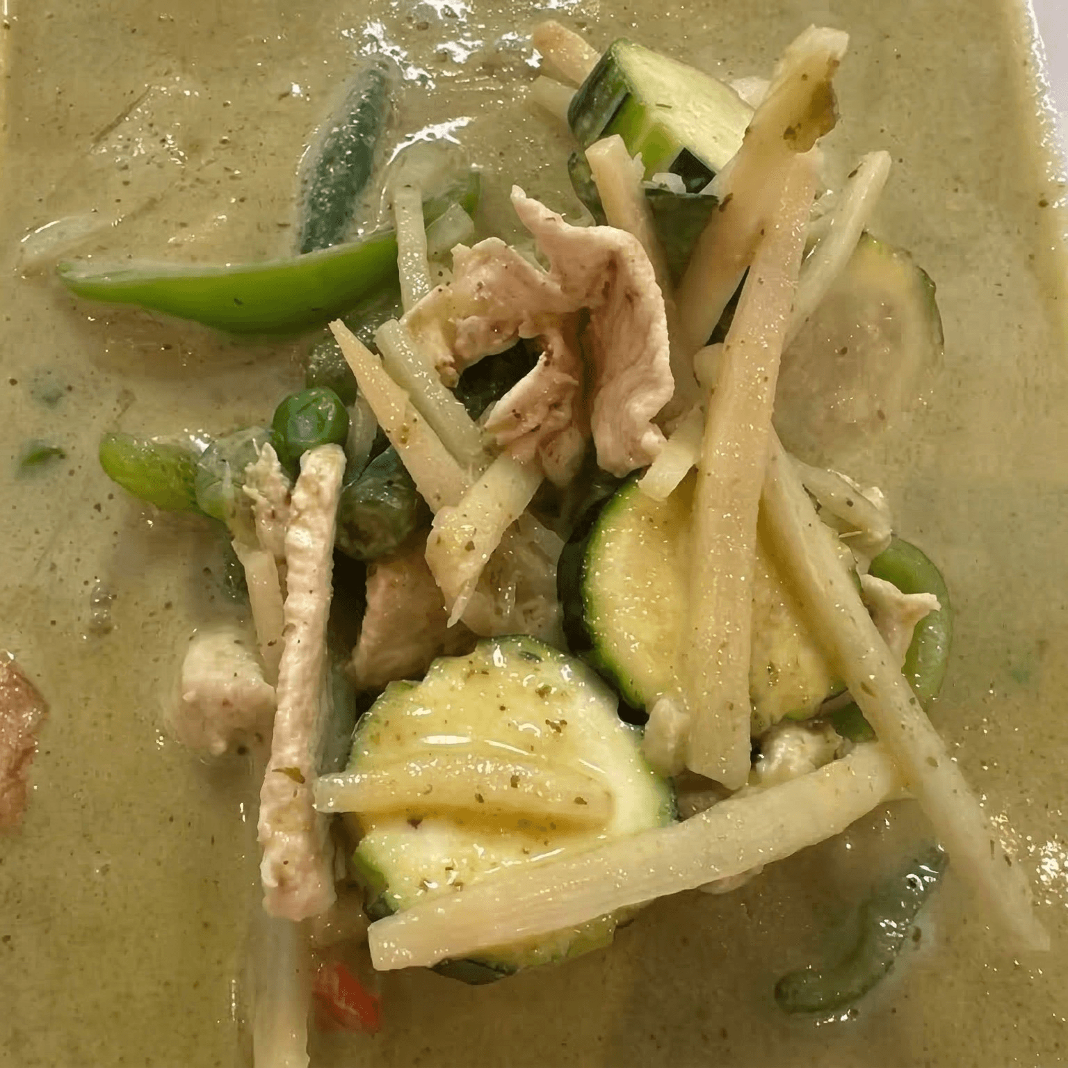Mild. green curry in coconut milk with green peas, carrots, bell pepper and sweet basil