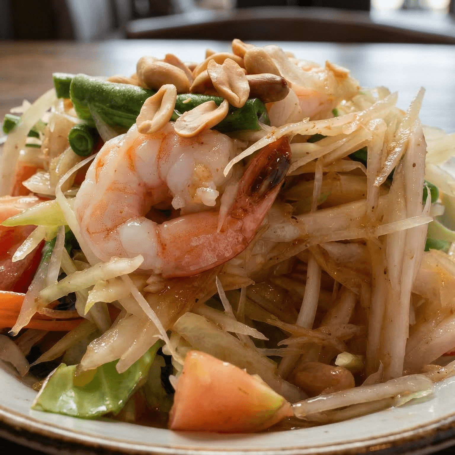 (papaya salad), sliced green papaya, carrots, tomatoes, chili pepper in dressing topped with peanuts and fresh shrimp
