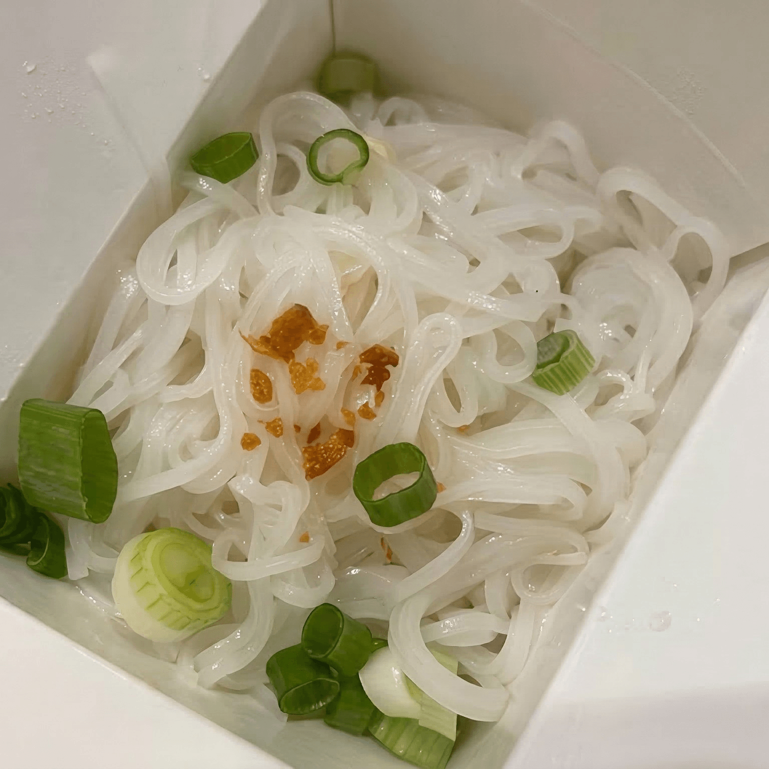 Laos style noodle in chicken broth served with pork meat loaf, green onion, topped with homemade fried garlic, white pepper powder