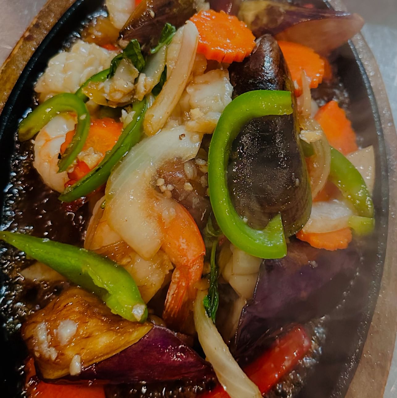Stir-fried calamari, prawns, fish and mussels with onions, bell pepper, eggplant, and carrots, served with hot sizzling plate