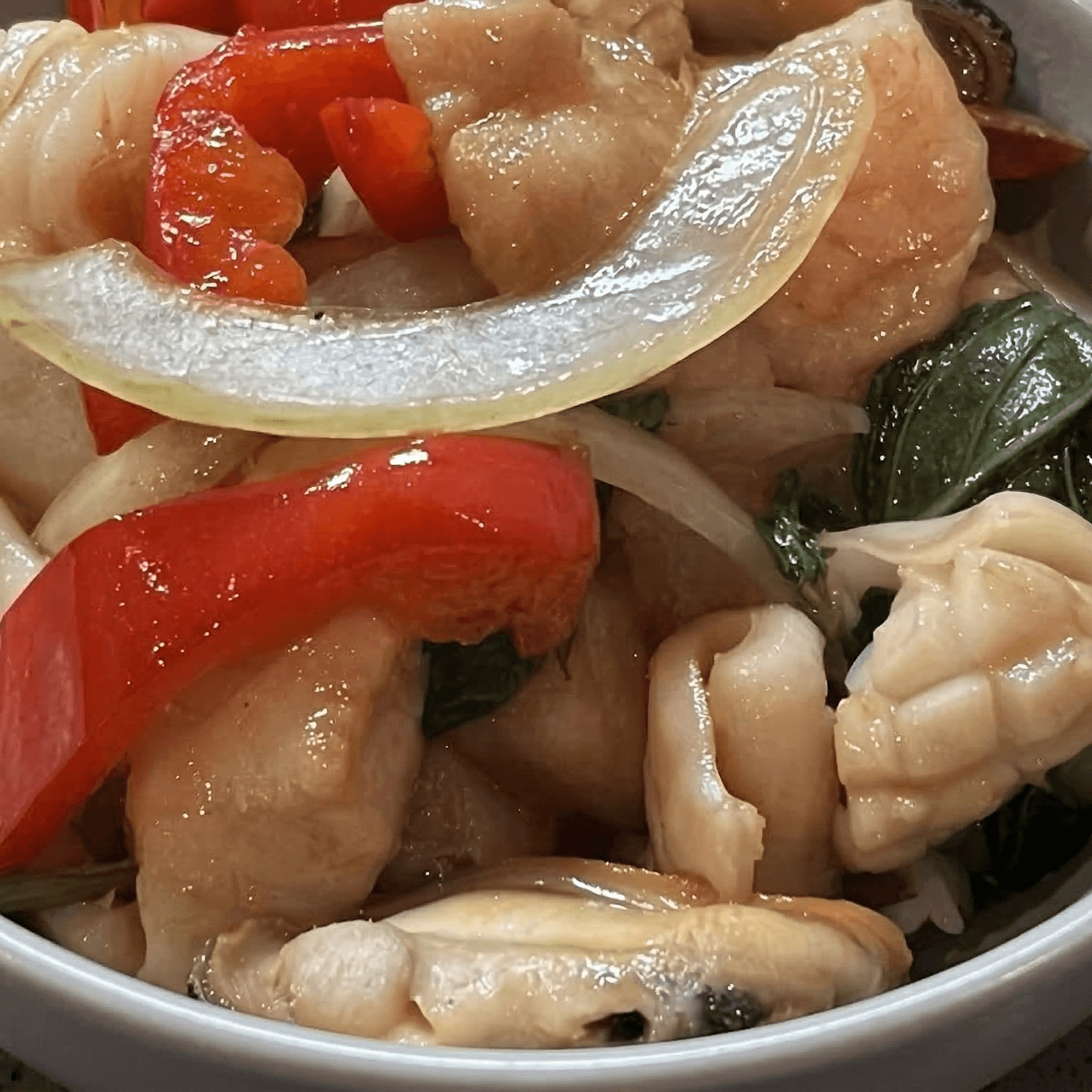 Sauteed shrimp, fish, calamari and mussels with garlic chili sauce, onion, bell peppers and sweet basil served with rice in a clay pot