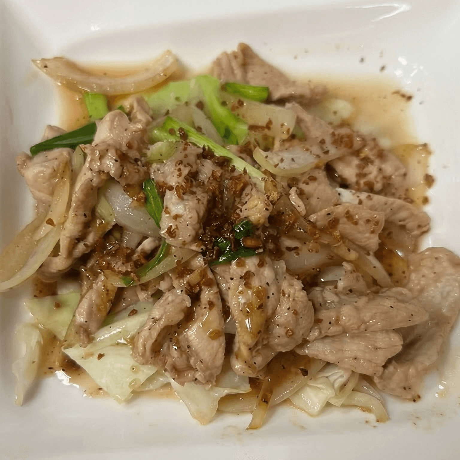 Sautéed meat with black mushrooms, onion, and bell pepper