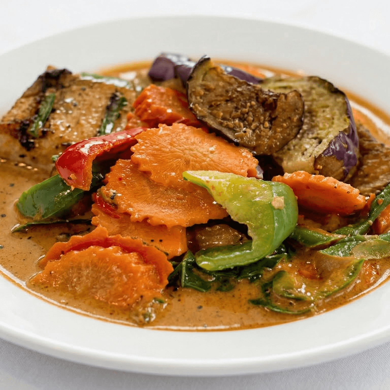 Mild. Fresh Alaskan salmon cooked with coconut milk, eggplant, carrots, bell pepper and sweet basil