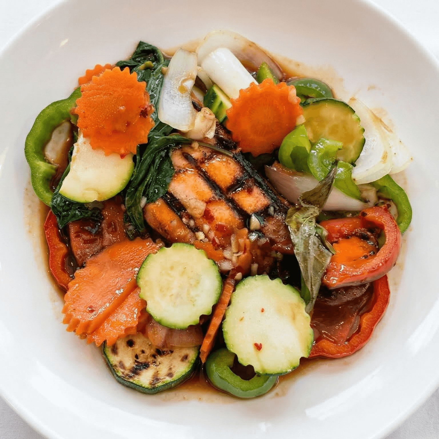 Grilled salmon cooked with green beans, carrots, zucchini, and garlic basil