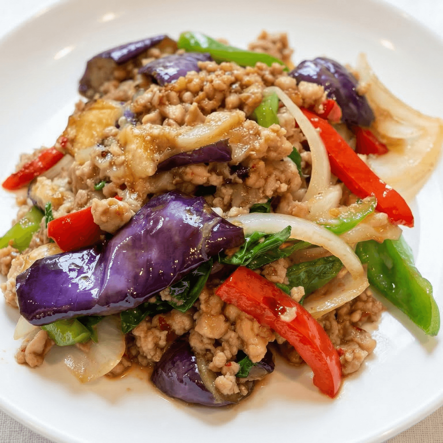 Sautéed ground or sliced meat, with eggplant, garlic, chili, onions, bell peppers, and basil