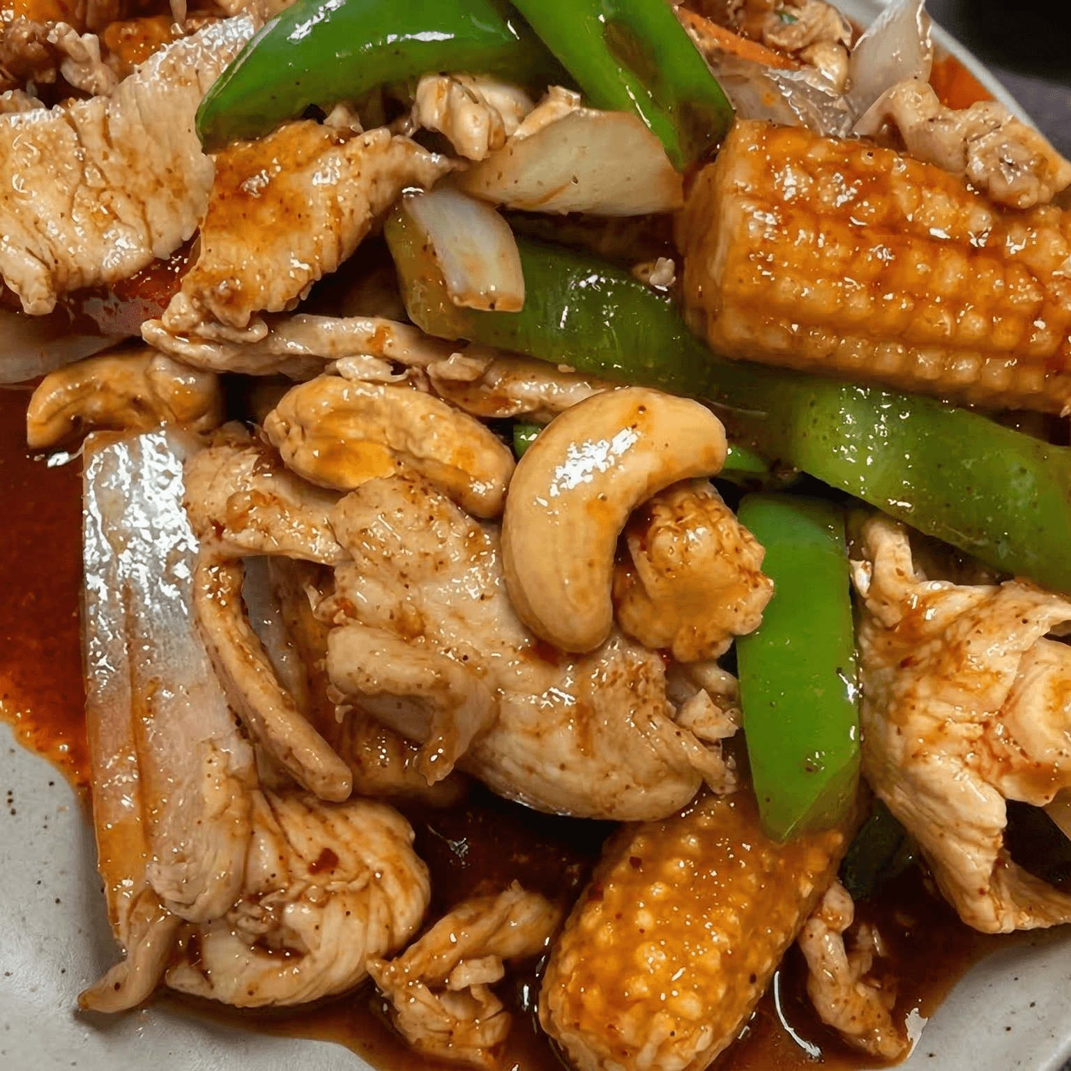 Stir fried bell peppers, carrot, baby corn, onion, cashew with chili paste