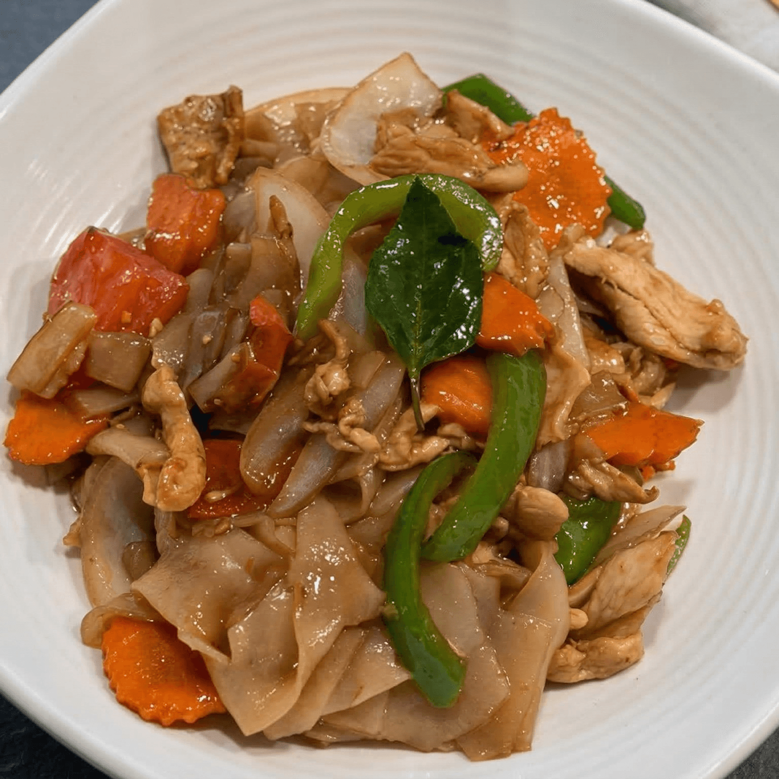 Mild. Pan-fried flat rice noodles with onions, tomatoes, cabbage, carrots, bell peppers, garlic, chili and basil